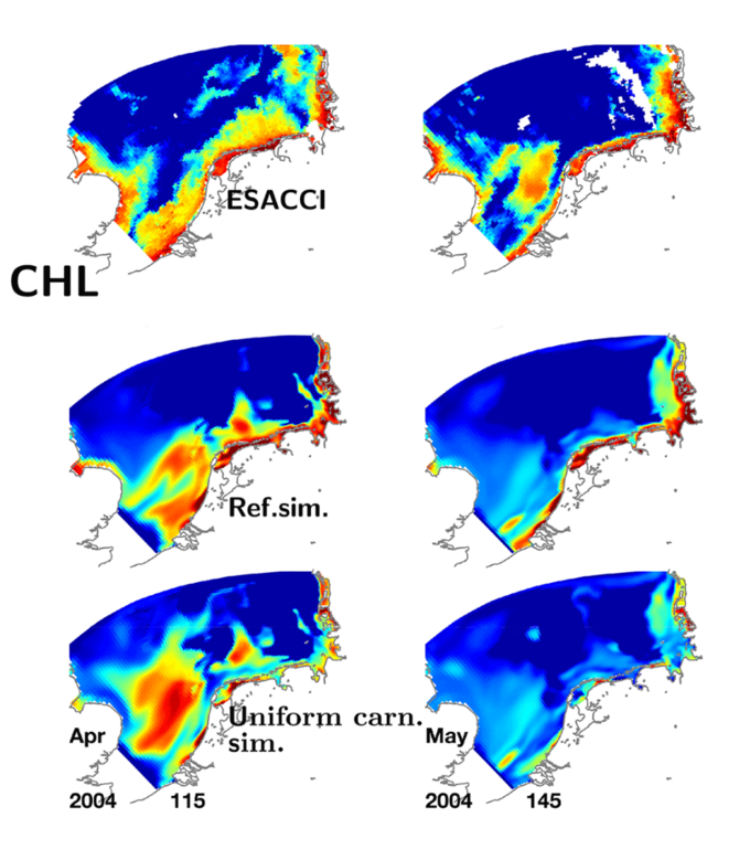 Mitte: Referenzsimulation mit Kaskadeneffekt, d.h. erhöhtem küstennahen Frassdruck auf Zooplankton. Es zeigt sich, dass eine solche ökosystemareModellierung, die komplexe Zusammenhänge und Interaktionen in Nahrungskette einschließt, besser die reale Entwicklung abbilden kann (vgl. Satellitenbild);