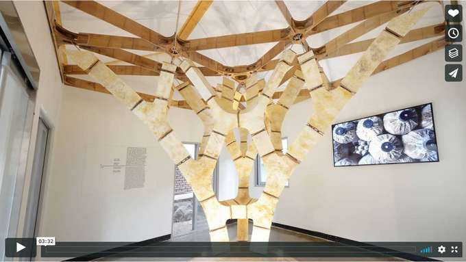 Der MycoTree ist eine verzweigte Struktur aus direkt in Form gewachsenen Pilz-Myzelium-Baublöcken, die mittels Bambus-Steckverbindungen zu einer verzweigten Struktur aufeinandergeschichtet wurden. Diese ist trotz des relativ weichen Baumaterials aus Pilzgeflecht erstaunlich stabil und trägt ihre Dachkonstruktion selbst. Das Video auf Vimeo zeigt den Myco Tree auf der Seoul Biennale for Architecture and Urbanism 2017.