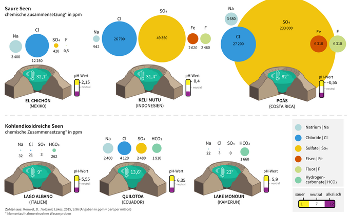 Wenn Seen noch immer in Verbindung mit entgasenden Magmasystemen stehen, verhält es sich anders. Der Zustand des entgasenden Magmas und die Art des Umgebungsgesteins entscheiden dann ganz immens über die Substanzen im Wasser, Wassertemperaturen und den Säuregrad (pH-Wert). Von allen bekannten Oberflächengewässern auf der Erde zeigen vulkanische Seen die größte Bandbreite an pH-Werten. Der pH-Wert des Seewassers kann außerhalb der Skala liegen, die willkürlich zwischen 0 (sauer) und 14 (alkalisch) festgelegt wurde (Pecoraino et al., 2015). So können die säurehaltigsten Seen, die hochaktive Vulkane bedecken, sogar Wasser mit pH-Werten unter Null aufweisen.